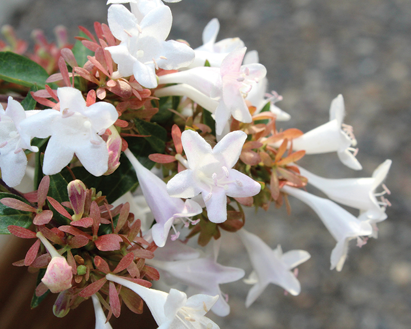Abelia is an attractive arching 2 – 3 m shrub with small leaves and white to pink bell-shaped flowers during summer and autumn. Abelias are perfect for growing in amongst other shrubs or trimmed into a hedge. They also do very well in a container. Many abelias have attractive reddish new foliage and variegated and dwarf varieties are also available.