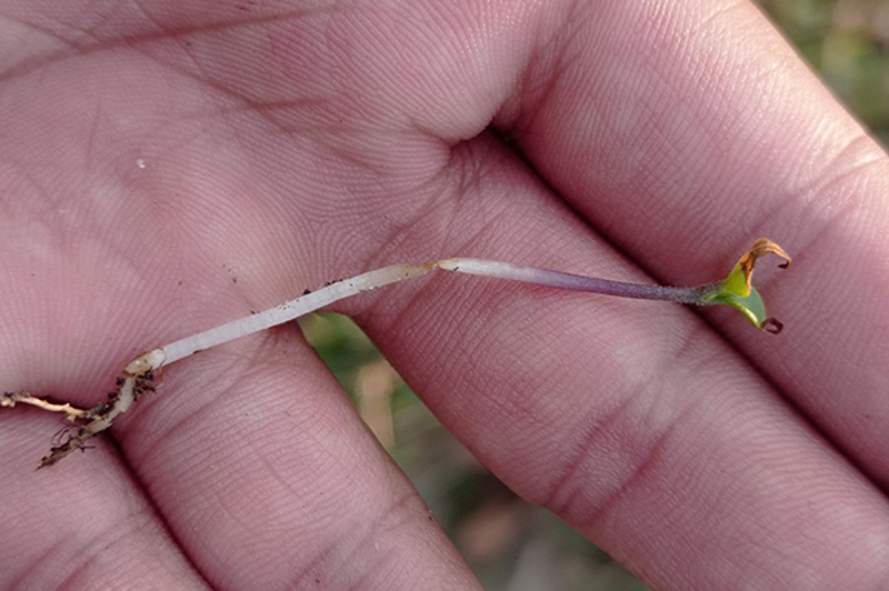 Seedlings can collapse and die immediately after they emerge from the soil. A common symptom is when healthy-seeming seedlings suddenly develop water-soaked or sunken thready-looking lesions on their stems, then flop over and die.