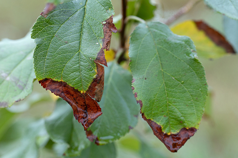 The earliest symptoms are browning of flowers and blackened flower stalks. The disease progresses into the fruiting spur, causing the growing tips to wilt and leaves to develop distinctive burnt-looking edges. Infected leaves continue to darken before dying off. The infection continues into the lateral branch, where it can form a brown, watery-looking canker on bark (most common in pears).