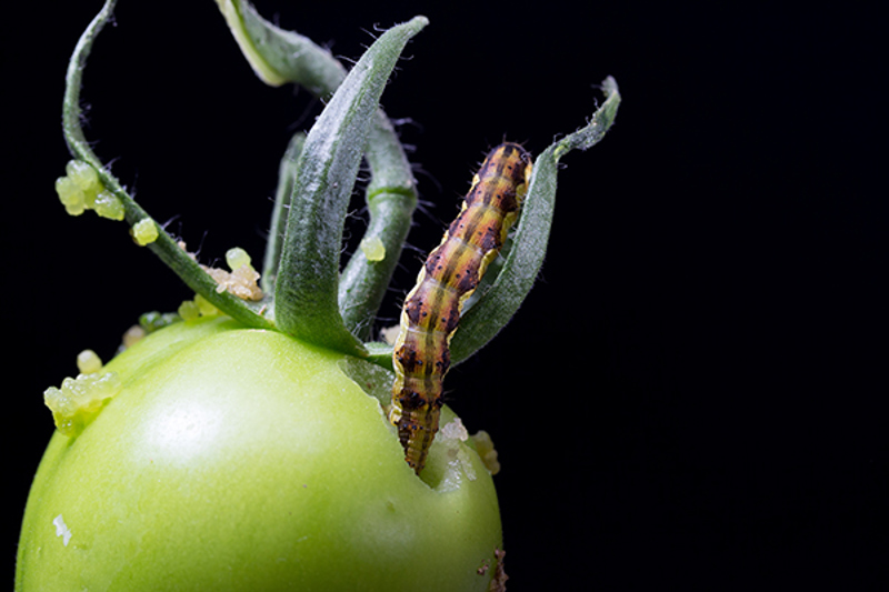 When feeding on tomato or citrus fruit, caterpillars will usually hide under or around the stalks and calyx. Holes chewed into the fruit will also most likely be close to the calyx.