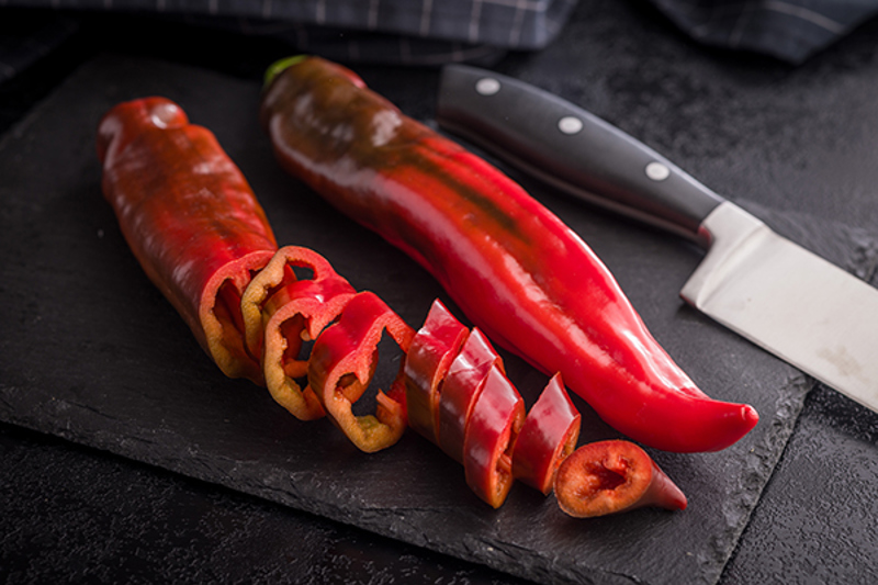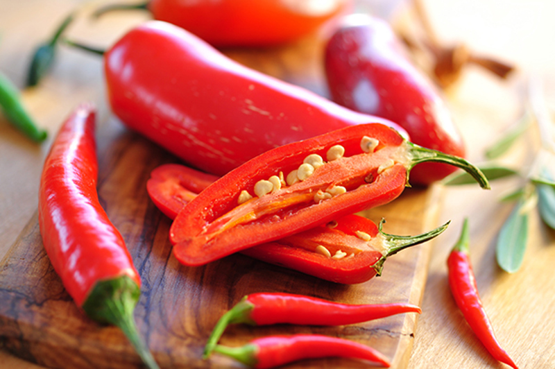 Chillies owe their spicy kick to an oily substance called capsaicin, which is mostly contained in the white pith around the seeds. Capsaicin has a fascinating effect on our bodies when we eat it - as soon as it touches the mucous membrane in our mouths, it triggers nerve sensors to send a false alarm to our brains, that we experience as a burning sensation. When you sweat or have a runny nose after eating hot chilli, that's your body responding to the false alarm by trying to cool you down!